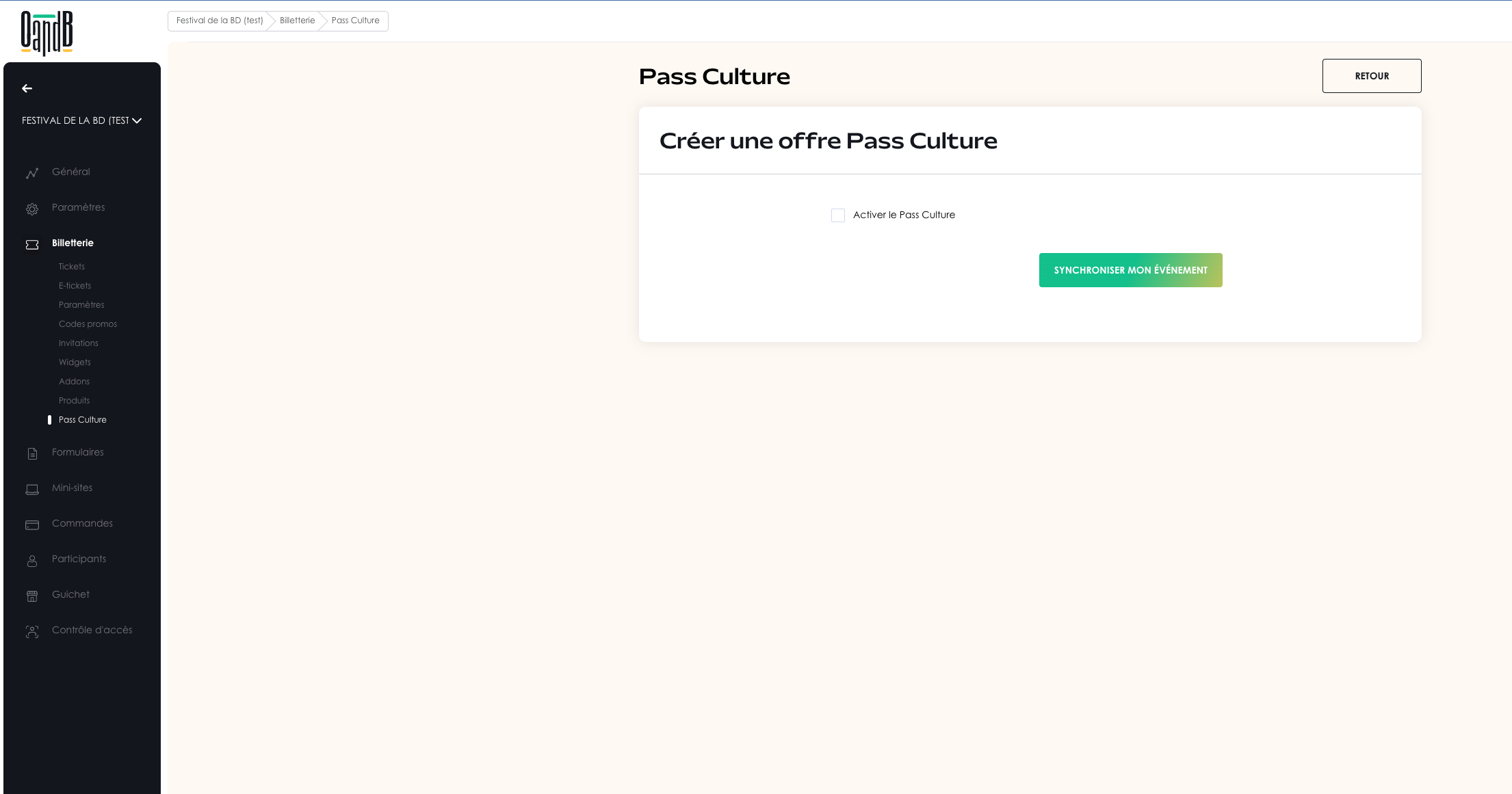 Dans le menu "Billetterie", accédez à "Pass Culture" puis cochez la case "Activer le Pass Culture"