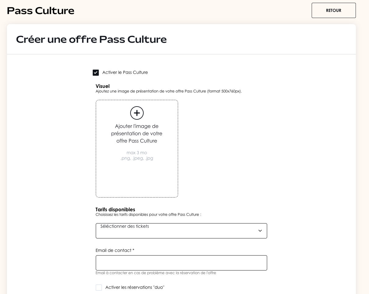 Activez ou non les réservations "Duo" permettant à l'utilisateur de réserver deux billets avec son compte Pass Culture.